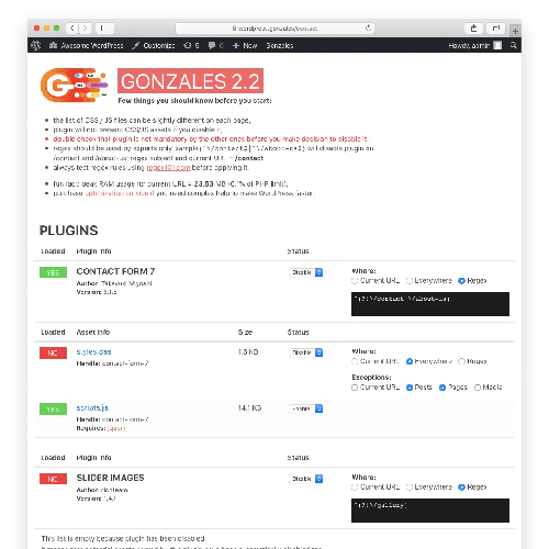Gonzales allows to conditionally disable CSS, JS and even plugins depending on page you visit. It’s simple and lightweight tool thanks which you’ll be able to get rid of overloaded website by excluding useless CSS and JS files registered by themes and plugins.
