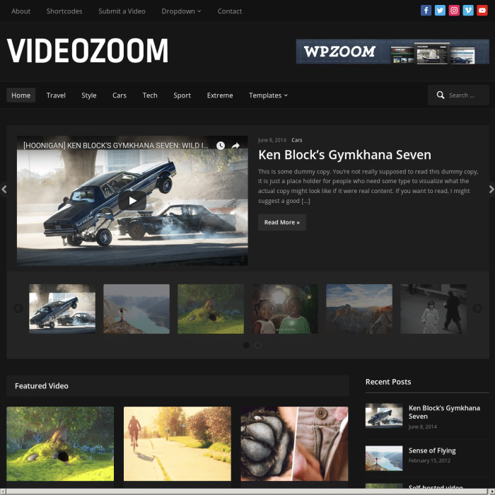 WPZoom Videozoom is a powerful video WordPress theme which allows you to showcase videos from all across the web. The flexible slider and support for self-hosted videos makes Videozoom the perfect choice.